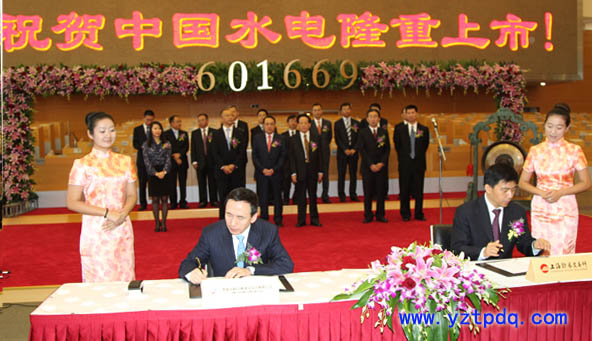 中國(guó)水電(股票代碼601669)首次公開發(fā)行A股上市儀式10月18日上午在上海證券交易所舉行。中國(guó)電力建設(shè)集團(tuán)公司董事長(zhǎng)、中國(guó)水利水電建設(shè)股份有限公司董事長(zhǎng)范集湘,中信建投證券股份有限公司董事長(zhǎng)兼總裁王常青,中銀國(guó)際證券有限責(zé)任公司副執(zhí)行總裁任勁,國(guó)務(wù)院國(guó)資委副秘書長(zhǎng)閆曉峰先后致辭;范集湘董事長(zhǎng)與上海證券交易所副總經(jīng)理徐明簽訂上市協(xié)議書;國(guó)務(wù)院國(guó)有企業(yè)監(jiān)事會(huì)主席李志群和中國(guó)電力建設(shè)集團(tuán)公司董事長(zhǎng)、黨委副書記、中國(guó)水利水電建設(shè)股份有限公司董事長(zhǎng)范集湘共同為中國(guó)水電上市鳴鑼。