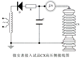 微安表必須有金屬屏蔽,應(yīng)采用屏蔽與被試品聯(lián)接。高壓引線的屏蔽引出應(yīng)與儀表端的屏蔽緊密聯(lián)接。如果被試品的表現(xiàn)污穢要排除被試品表面泄漏電流的影響可在被試品高電位端用裸體金屬軟線緊密繞幾圈后與高壓引線的屏蔽相聯(lián)接(見下圖)。