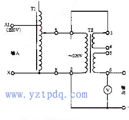 眾所周知,普通的交流接觸式調(diào)壓器的調(diào)壓范圍,均是在0~250V之間,因輸入電壓為220V,所以最大的輸出電壓僅比輸入電壓高30V。若按圖所示,用一臺(tái)交流接觸式調(diào)壓器T1和一只初級(jí)220V,次級(jí)為雙30V的電源變壓器T2(要求T2功率大于用電器具的功率)串聯(lián)使用,則可實(shí)現(xiàn)輸出電壓比輸入電壓提高90V。