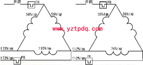 三角形接法的電動機(jī)在滿載運行時,如果一相斷電,則其余兩根電源線中的線電流約為額定電流的173%,熱繼電器能動作,可以起到斷相保護(hù)作用。如果電動機(jī)在55%—67%額定負(fù)載下運行,電源一相斷電(見圖左),這時兩相繞組的電流為38% 額定線電流。一相繞組的電流為74%額定線電流,大于原額定相電流(58%I額),這相繞組的過電流為: