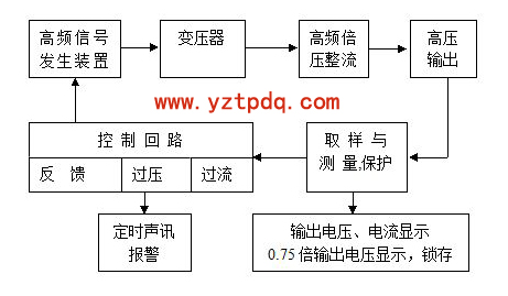 高壓直流發(fā)生器應(yīng)用電力電子技術(shù),采用先進(jìn)的PWM調(diào)制技術(shù)及大功率MOSFET器件,通過中頻倍壓整流而成;該設(shè)備具有紋波系數(shù)小、輸出穩(wěn)定可靠,體積小、重量輕的特點,且具有可靠、靈敏的內(nèi)部保護(hù)功能,其原理框圖如圖所示。