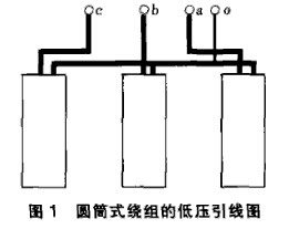 對于小型配電變壓器,例如500kVA及以下的產(chǎn)品,低壓為圓筒式繞組,y接線在繞組的上部(見圖1)。中性點引線很短,雖然設(shè)計規(guī)定引線設(shè)計按25%額定電流設(shè)計,但在實際制造中,有的與其它引線相同,有的截面略小,因此中性點引線電阻所占比例不大,測線電阻、相電阻能滿足標準要求。