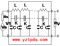 圖中:L、K及C分別代表繞組單位長(zhǎng)度的分布電感、分布電容及對(duì)地分布電容,V1、V2分別為等效網(wǎng)絡(luò)的激勵(lì)端電壓和響應(yīng)端電壓,Vs為正弦波激勵(lì)信號(hào)源電壓,Rs為信號(hào)源輸出阻抗,R為匹配電阻。