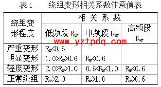 相關(guān)系數(shù)是表明兩條曲線波峰或波谷分布位置及分布數(shù)量變化的量化參數(shù),直觀地描述了頻響曲線之間的相似程度。數(shù)值越大表明兩條曲線重合度越好,越小表明重合度越差,它是判斷繞組是否變形的主要數(shù)值判據(jù)。變壓器繞組變形測(cè)試儀對(duì)相關(guān)系數(shù)的規(guī)定見(jiàn)表1,在實(shí)際應(yīng)用中我們發(fā)現(xiàn)其高頻段相關(guān)系數(shù)受外界影響較大,高頻段相關(guān)系數(shù)僅供參考。