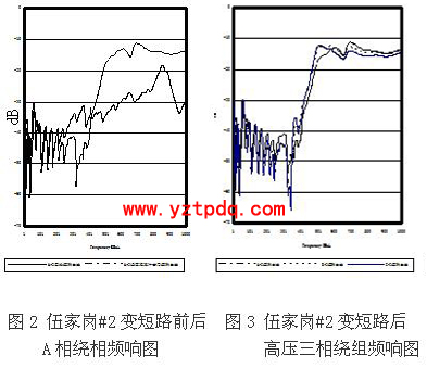 2) 2004年6月14日,雨天,110KV伍家崗變電站10KV宜12開(kāi)關(guān)線路因樹(shù)障產(chǎn)生鐵磁諧振過(guò)電壓造成2#主變10KV側(cè)開(kāi)關(guān)相間閃絡(luò)并發(fā)生爆炸,保護(hù)正確動(dòng)作跳2#主變?nèi)齻?cè)開(kāi)關(guān)。該變壓器2003年11月曾做過(guò)繞組變形試驗(yàn),留存了原始頻響曲線,因此可以做縱向分析。中低壓繞組低段段相關(guān)系數(shù)都大于2,中頻段都大于1,認(rèn)為中低壓繞組未出現(xiàn)變形。高壓繞組高頻部分相關(guān)系數(shù)大于2,但中頻相關(guān)系數(shù)小于1,分別為0.42、0.44、0.41,圖2為A相頻響圖。如果僅從相關(guān)系數(shù)上來(lái)判斷,就會(huì)得出高壓繞組已出現(xiàn)明顯變形的結(jié)論。中頻段波分布電感和分布電容的變化都會(huì)使波峰和波谷出現(xiàn)位移。為了確認(rèn)我們的結(jié)論,加做了短路阻抗試驗(yàn),因試驗(yàn)容量不夠,我們未做中壓對(duì)低壓短路阻抗值,高壓對(duì)低壓繞組的三相電抗值和高壓對(duì)中壓繞組的三相電抗值分別相差0.6%、0.12%,短路阻抗與銘牌值也無(wú)大的變化,相差分別為0.2%、0.99%,短路阻抗的結(jié)果顯示未出現(xiàn)變形,這與我們頻響曲線分析的結(jié)果互相矛盾。如果高壓繞組出現(xiàn)明顯變形,會(huì)導(dǎo)致中壓繞組的分布電容出現(xiàn)一定的變化,中壓繞組的頻響曲線也會(huì)與原始曲線出現(xiàn)一定的差異,而中壓繞組頻響曲線吻合性相當(dāng)好,這也從另一個(gè)方面否定了高壓繞組明顯變形的可能。又對(duì)高壓三相繞組頻響曲線進(jìn)行橫向分析:2003年11月的高壓繞組三相頻響曲線中頻段相關(guān)系數(shù)分別為2.08、1.99、1.89,短路后三相繞組中頻段相關(guān)系數(shù)為1.68、1.75、1.45,一致性也相當(dāng)好(圖3為三相橫向比較頻響圖),這也使我們更加堅(jiān)信高壓繞組未出現(xiàn)變形,畢竟三相同時(shí)出現(xiàn)變形的機(jī)率太小。這三點(diǎn)分析都認(rèn)為高壓繞組未出現(xiàn)變形,再考慮到短路后三相差動(dòng)保護(hù)動(dòng)作,電氣試驗(yàn)情況良好,色譜數(shù)據(jù)正常,因此下出了高壓繞組未出現(xiàn)變形的結(jié)論。該變壓器投運(yùn)后安全運(yùn)行至今,多次的色譜追蹤也顯示該變壓器無(wú)異常,這說(shuō)明當(dāng)初的分析和判斷是正確的。