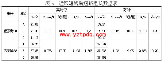3) 2004年12月8日,雨天,10KV黃磷二回古21開(kāi)關(guān)因線路接地,產(chǎn)生過(guò)電壓,導(dǎo)致10KV母線短路,古老背2#主變差動(dòng)速斷動(dòng)作,2#主變?nèi)齻?cè)開(kāi)關(guān)跳閘。當(dāng)天我們進(jìn)行了繞組變形試驗(yàn),通過(guò)與歷史曲線對(duì)比,我們發(fā)現(xiàn)中低壓側(cè)頻響曲線一致性相當(dāng)好,但高壓繞組A相高頻段相關(guān)系數(shù)為1.33,分析頻響圖譜發(fā)現(xiàn)相關(guān)系數(shù)不好的原因不是波峰波谷的變化,而是A相繞組在2K頻率下幅值比歷史曲線低。短路阻抗測(cè)試結(jié)果顯示高壓對(duì)低壓三相繞組電抗值相差僅0.736%,高壓對(duì)低壓繞組短路阻抗與銘牌值相比,相差1.506%,高壓對(duì)中壓短路阻抗值與銘牌值相差0.99%,見(jiàn)表5。直流電阻測(cè)量也顯示無(wú)匝間或?qū)娱g短路。該變壓器原為無(wú)載調(diào)壓變壓器,在城網(wǎng)改造中進(jìn)行過(guò)無(wú)載改有載改造,將高壓中性點(diǎn)解開(kāi),拆分為X、Y、Z后外加三只套管引出,通過(guò)三根跳線引至調(diào)壓變壓器。試驗(yàn)時(shí)因雨未將架空線與X、Y、Z三只套管解開(kāi),而是直接將架空線與調(diào)壓變的聯(lián)結(jié)解開(kāi),這樣A 相繞組尾端末懸空并連有約2m長(zhǎng)的跳線。2K頻率下繞組響應(yīng)幅值比歷史曲線下降的原因在于引線未拆除。 引線感應(yīng)電壓的影響(1#主變?nèi)栽谶\(yùn)行,相距約4米)、引線與高壓A相套管的接觸不良均會(huì)造成此現(xiàn)象發(fā)生。因此我們下出高壓繞組A相無(wú)變形的結(jié)論,目前該變壓器一直安全運(yùn)行。