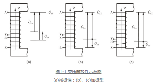 變壓器或互感器均存在多個繞組,多個引出端子,為了說明繞在同一鐵芯上的兩個繞組的感應(yīng)電動勢的相對關(guān)系采用了”極性“這一概念。同一鐵芯上的變壓器繞組有同一磁通流過,兩繞組若以同側(cè)線端為起始端,變壓器繞組向相同,則感應(yīng)電動都方向相同;繞向相反,則感應(yīng)電動勢方向相反。所以變壓器繞組的繞向和端子標(biāo)號一經(jīng)確定,就可以用”加極性“和”減極性“來表示兩個繞組之間的感應(yīng)電動勢的關(guān)系。在圖1-1(a)中,兩繞組繞向相同,在同一磁通穿過時,兩繞組內(nèi)的感應(yīng)電動勢在同名端子間任何瞬間都有相同極性,此時一、二次電壓?AX和?ax相位相同,如連接X和x,?Aa等于兩電壓差,則該變壓器的兩繞組就為”減極性“關(guān)系。如將二次繞組標(biāo)號交換[見圖1-1(b)所示],顯然同名端子間的電動勢將變成相反方向,電壓相位差為180°,這時連接Xx后,?Aa是?Ax 與?ax之和。則變壓器此兩繞組之間是”加極性“關(guān)系。同理,在圖1-1(c)中,保持圖1-1(a)中的繞組標(biāo)號。而將ax繞組繞向改變,則變壓器兩繞組又成了”加極性“關(guān)系。