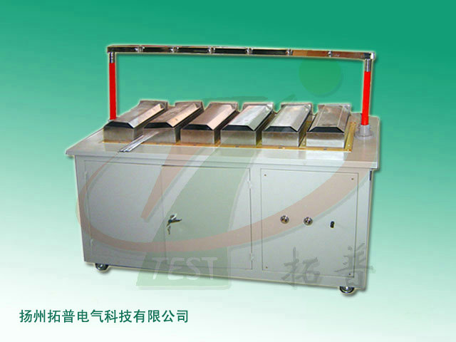 由水槽、控制臺(tái)兩部分組成。水槽分上下區(qū),上區(qū)為6只小水槽,下區(qū)為試驗(yàn)變壓器,控制臺(tái)設(shè)有過流保護(hù)、零位保護(hù)、時(shí)間保護(hù)及報(bào)警等功能。