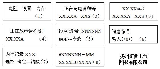 儀器開機或按復(fù)位鍵后,進(jìn)入初始狀態(tài)(1)。此時光標(biāo)指針指向“電阻”,直接按“確定”鍵進(jìn)入狀態(tài)(2),顯示變化的充電電流和測量時間,充電完成后自動進(jìn)入狀態(tài)(3),顯示電阻值、測量電流和測量時間,此時每一次“確定” 鍵則儲存一次測量結(jié)果(帶打印機的機型同時打印出測量結(jié)果)。按“復(fù)位”鍵退出電阻測量,進(jìn)入狀態(tài)(4),顯示放電電流。放電結(jié)束后,自動回到初始狀態(tài)(1),完成一次電阻測量。