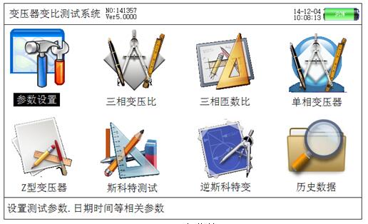 當(dāng)開機后顯示主菜單,如圖所示的主菜單界面。主菜單共有八個功能選項,包括:參數(shù)設(shè)置、三相變壓比、三相匝數(shù)比、單相變壓器、Z型變壓器、斯科特測試、逆斯科特變、歷史數(shù)據(jù),通過↑、↓、←、→鍵進行選擇,選中的項目文字為反白顯示(圖中選中項目為“參數(shù)設(shè)置”),按確定鍵進入相應(yīng)功能界面;屏幕頂端一行顯示狀態(tài)參量,包括:程序版本號,日期時間等,同時顯示出內(nèi)部電池的電壓幅值和剩余電量,以便操作人員隨時觀察儀器電池狀態(tài),當(dāng)發(fā)現(xiàn)電池虧電時可及時充電;屏幕下方一行為提示欄,為用戶進行簡單的操作提示,方便用戶正確操作。