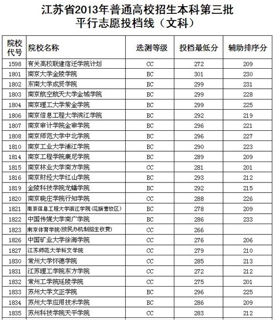 1. 2013年8月3日上午,江蘇省考試院公布了《江蘇省2013年普通高校招生本科第三批平行志愿投檔線》,詳文見下: