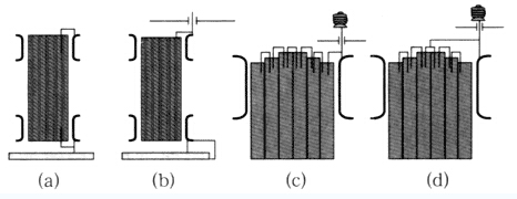 鐵芯接地方式如圖1所示。圖1中(a)是一種最簡單的接地方式,在油箱內(nèi)部完成,在同一側(cè)的上軛和下軛插入接地銅帶,上軛接地片與上夾件相接,下軛接地片與下夾件相接再與墊腳相接而接地,上夾件是通過鐵芯而接地的。這種方式多用于中等容量或較小容量的變壓器。圖1中(b)是鐵芯接地片與上夾件連結(jié),然后經(jīng)套管引出油箱外部再接地,下夾件與墊腳經(jīng)箱底接地,鐵芯與油箱間是絕緣的,這種結(jié)構(gòu)的上夾件不能與油箱接觸。圖1中(c)和(d)均用于鐵芯總厚度很大的大型變壓器,這種變壓器往往在疊片組中每隔一定厚度放置一層油隙,以改進散熱性能,或每隔一定厚度墊一層絕緣紙以降低渦流損耗。這時鐵芯被隔開成若干組,切斷了電容接地的路徑。為求得電位的盡可能均勻,要把各個被隔開的片組用∩形銅帶串聯(lián)起來。如鐵芯厚度很大時,采用(d)方式,即由中央部分接地,可使電位更均勻些。