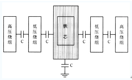在變壓器正常運行中,帶電繞組及引線與油箱間構(gòu)成的電場為不均勻電場,鐵芯和其它金屬構(gòu)件就處于該電場中。圖2示出了變壓器鐵芯不接地時的斷面示意。由圖2可見,高壓繞組與低壓繞組之間、低壓繞組與鐵芯之間、鐵芯與大地(變壓器油箱)之間都存在著寄生電容,帶電繞組將通過寄生電容的耦合作用使鐵芯對地產(chǎn)生一定的電位,通常稱為懸浮電位。由于鐵芯及其它金屬構(gòu)件所處的位置不同,具有的懸浮電位也不同,當兩點之間的電位差達到能夠擊穿其間的絕緣時,便產(chǎn)生火花放電,這種放電是斷續(xù)的,放電后兩點電位相同,但放電立即停止,然后再產(chǎn)生電位差,再放電……。斷續(xù)放電的結(jié)果使變壓器油分解,長期下去,逐漸使變壓器固體絕緣損壞,導致事故發(fā)生。為避免上述情況發(fā)生,國標規(guī)定,變壓器鐵芯和較大金屬零件均應通過油箱可靠接地,20 000 kVA及以上的變壓器,其鐵芯應通過套管從油箱上部引出并可靠接地。具體做法是將變壓器鐵芯與變電站的接地系統(tǒng)可靠連接。這樣,鐵芯與大地之間的寄生電容被短接,使鐵芯處于零電位,這時在地線中流過的只是帶電繞組對鐵芯的寄生電容電流。對三相變壓器來說,由于三相結(jié)構(gòu)基本對稱,三相電壓對稱,所以三相繞組對鐵芯的電容電流之和幾乎等于0。