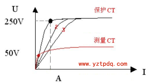 2、測得的伏安特性曲線與過去或出廠的伏安特性曲線比較,電壓不應有顯著降低。若有顯著降低,應檢查二次繞組是否存在匝間短路。當有匝間短路時,其曲線開始部分電流較正常的略低,如圖中曲線 2、3 所示(指保護 CT 有匝間短路,曲線 2 為短路 1 匝,曲線 3 為短路 2 匝),因此,在進行測試時,在開始部分應多測幾點。
