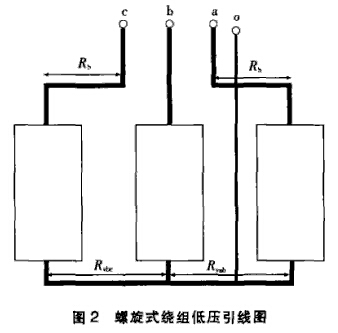 但對于630kVA及以上的配電變壓器,低壓多為螺旋式繞組,y接線在繞組的下部(如圖2所示)。中性點引線較長,按25%額定電流設(shè)計。這樣,中性點引線電阻隨著容量的增大,所占的比重越來越大。執(zhí)行JB/T501-1991時,就會出現(xiàn)Rca>Rab=Rbc,這一規(guī)律完全是產(chǎn)品結(jié)構(gòu)造成的。