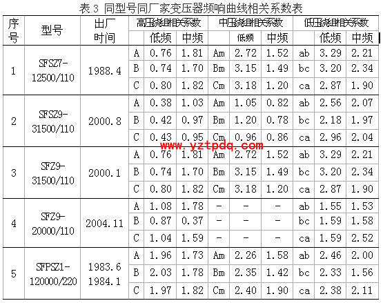 7) 同型號(hào)同廠家變壓器頻響曲線相關(guān)系數(shù)分析:對(duì)宜昌電網(wǎng)中5種型號(hào)的10臺(tái)變壓器(其中220KV變壓器2臺(tái),110KV變壓器8臺(tái))相關(guān)系數(shù)分析,發(fā)現(xiàn)同型號(hào)變壓器低壓側(cè)對(duì)應(yīng)繞組頻響曲線一致性明顯好于中高壓側(cè)繞組,高壓側(cè)一致性最差。具體數(shù)據(jù)見(jiàn)表3,原因在于:一,高壓套管位置較高,受感應(yīng)電壓影響較大;二是引線與套管之間的雜散電容的影響。因此在實(shí)際判斷繞組有無(wú)變形時(shí),若無(wú)原始曲線需要與同廠同型同期變壓器測(cè)試結(jié)果相比較時(shí),應(yīng)對(duì)高中低三側(cè)繞組區(qū)別對(duì)待,高壓側(cè)繞組頻響曲線僅有參考價(jià)值。