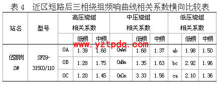 3) 在用頻率響應(yīng)法判斷繞組是否存在變形時(shí),以頻響曲線與歷史曲線縱向比較為主要依據(jù),相關(guān)系數(shù)好(波峰和波波谷無(wú)位移)說(shuō)明繞組未變形,如果相關(guān)系數(shù)不好,必須輔以阻抗電壓法加以驗(yàn)證,并參考三相繞組頻響曲線進(jìn)行橫向比較。在阻抗電壓變化高于4%時(shí),表明變壓器繞組已發(fā)生嚴(yán)重變形,應(yīng)該立即退出運(yùn)行;阻抗電壓變化高于2%時(shí)應(yīng)引起足夠的重視。