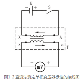 變壓器的極性通常采用直流法來確定。如圖1-2所示,測量時,用一個電池,將其”+“極接于變壓器一次繞組A端,”-“級接于X端;將毫安級電流表或伏安級電壓表”+“端接于二次繞組的a端,”-“端接于x端。接好線后,若將開關(guān)S合上時,毫安表向正向偏轉(zhuǎn),而拉開開關(guān)S時指針指向負(fù)方向偏轉(zhuǎn),則說明變壓器繞組A 、a端同極性。如指針擺動與上述相反,說明變壓器繞組A 、a端極性相反,變壓器加極性。