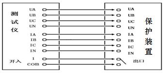 假設(shè):低電壓閉鎖定值為60V(指線電壓),過電流定值為5A。將測(cè)試儀的UA、UB、UC、UN;IA、IB、IC和IN分別接入變壓器后備保護(hù)的交流輸入端,同時(shí)將保護(hù)出口跳閘接點(diǎn),接入測(cè)試儀的開關(guān)量輸入端1,設(shè)置IA=6A,IB=IC=0,UA=UB=UC=57V,相位互差120度。選擇UA、UB和UC同時(shí)可變,60/1.732=34.64,用【手動(dòng)試驗(yàn)】方式同時(shí)遞減三相電壓,當(dāng)UA=UB=UC=34.64V時(shí),保護(hù)動(dòng)作。