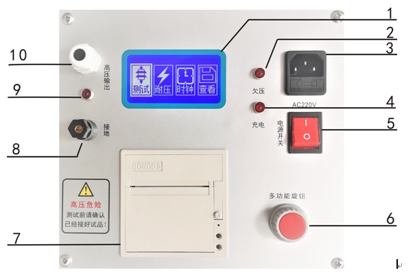9、高壓輸出指示燈(當有高壓輸出時燈亮,沒有高壓輸出時燈滅。)